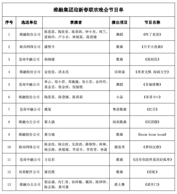 隨著2017維融集團(tuán)迎新春聯(lián)歡晚會(huì)進(jìn)入倒計(jì)時(shí),與之相配套的集團(tuán)、分公司、子公司都在緊鑼密鼓地進(jìn)行節(jié)目排練。下面,就讓小編來(lái)劇透下,看看今年集團(tuán)晚會(huì)有哪些精彩吧!