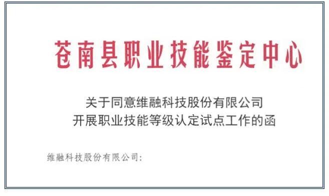 9月9日,蒼南縣職業(yè)技能鑒定中心發(fā)文同意維融科技開展職業(yè)技能(計算機及外部設備裝配調(diào)試員、信息通信網(wǎng)絡終端維修員兩個工種)等級認定試點工作。